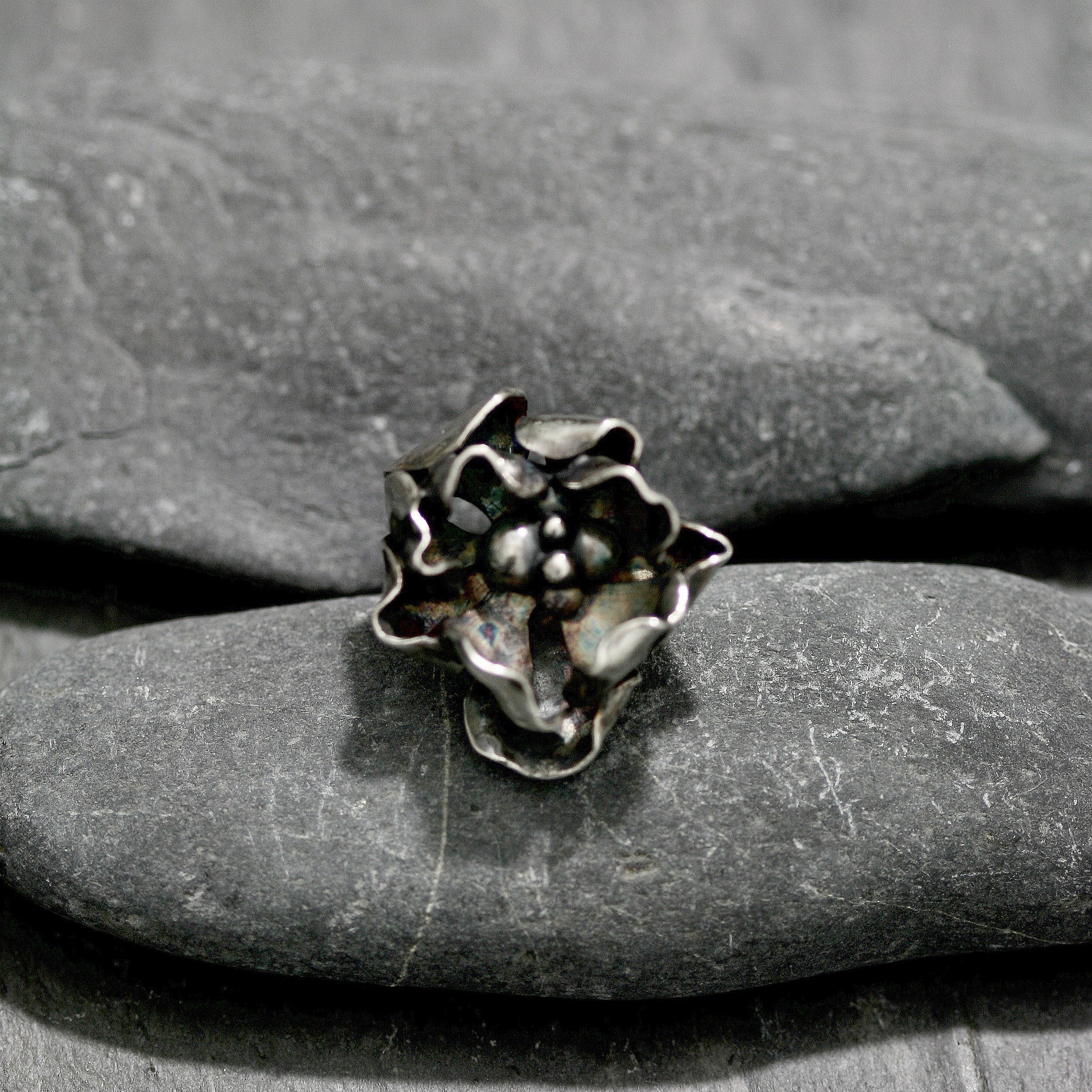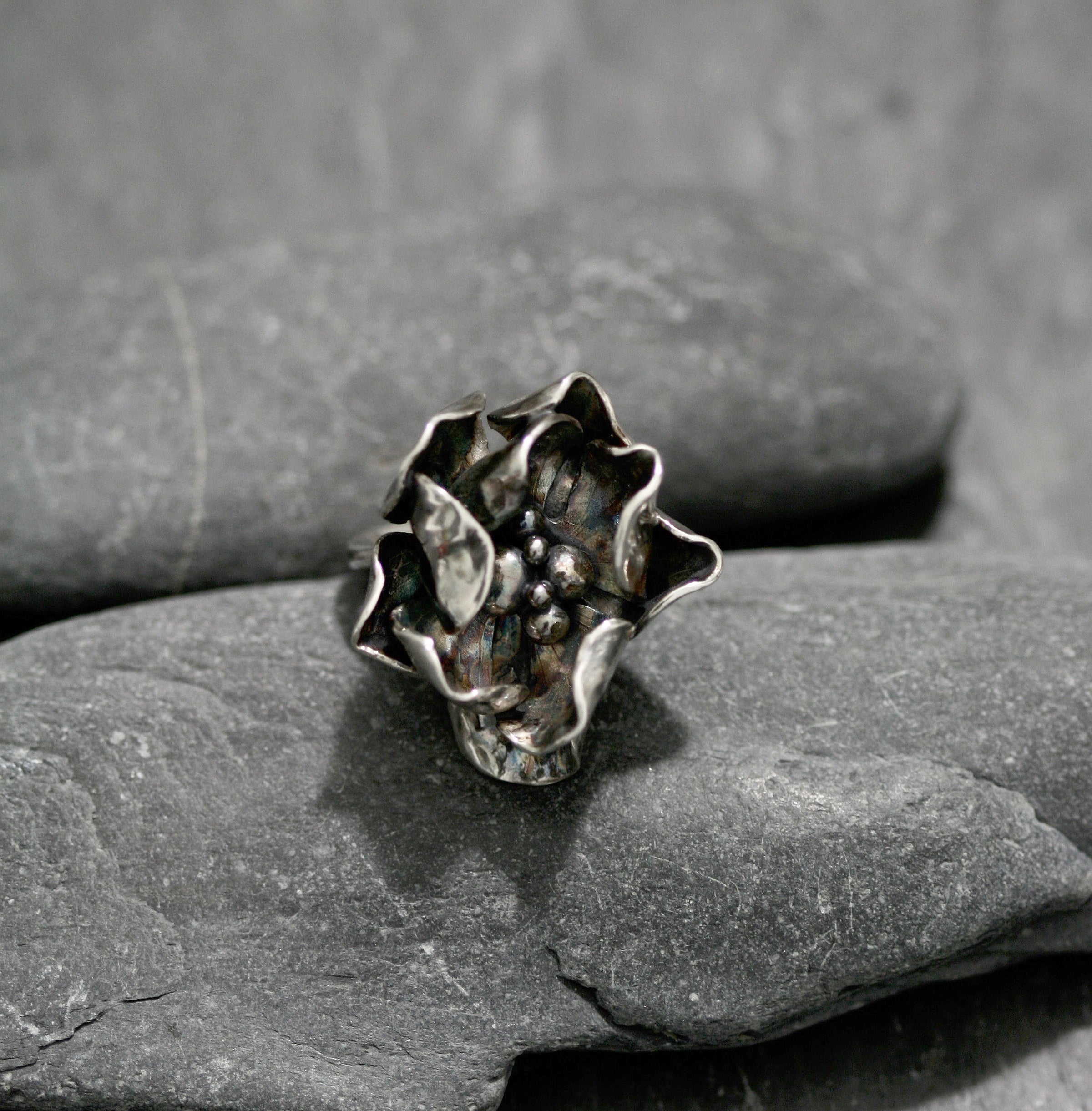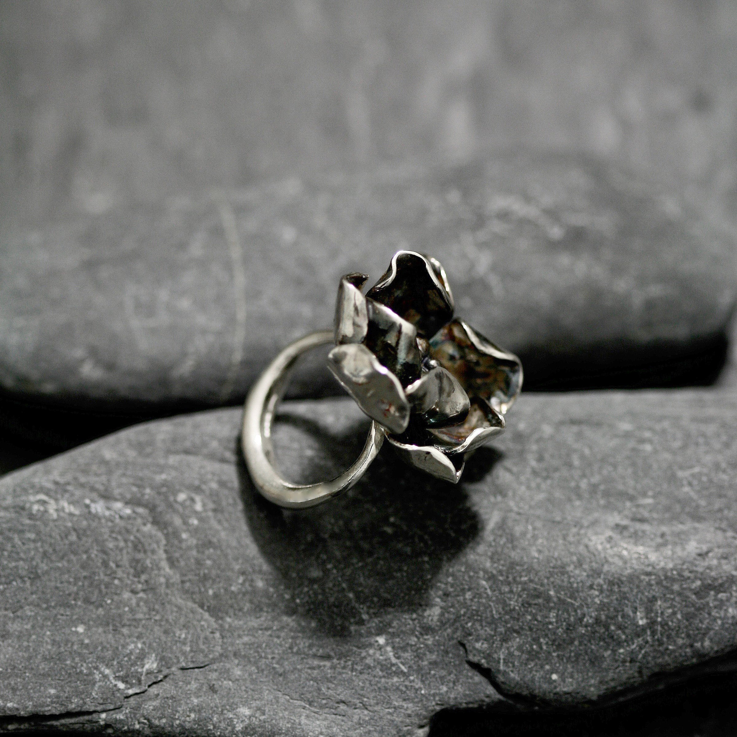 A Sterling silver hand carved flower ring with two layers of individually textured and shaped rose petals. Treated with gentle oxidation techniques and re-polished making every piece a unique design in its own right. With a carved ring style shank. Silver floral jewellery handmade in the UK.