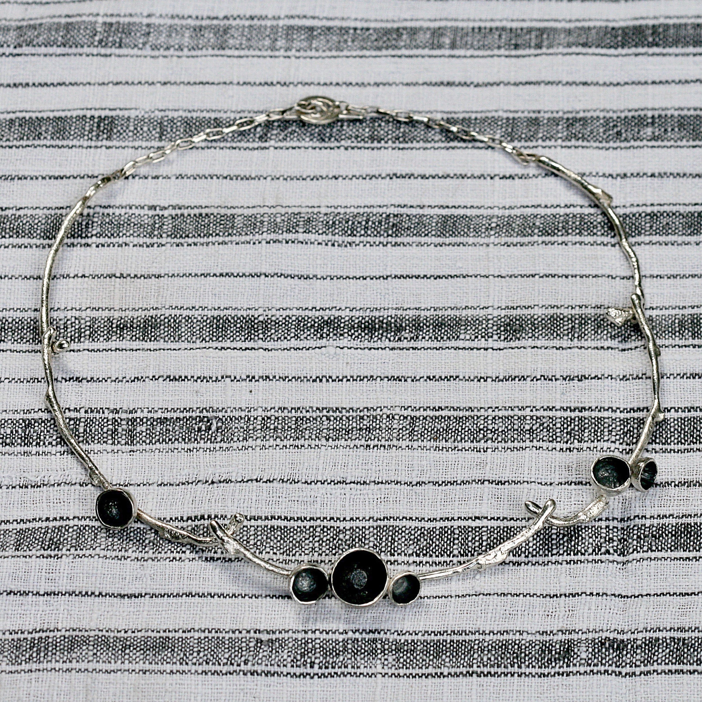 My Acorn Grand Necklace is a gloriously stylish piece. I handmake each section reticulating the Sterling silver to make them look like twigs before I assemble the piece and solder on my acorn cups. I finish the acorns in 22ct yellow gold vermeil or darkly oxidise them. It should sit on the nape of the neck about 16.5 inches. I have used an attractive long oval link chain that allows for easier alterations. Each time I make it, due to the variance in reticulation it turns out slightly different makes each one a unique piece.