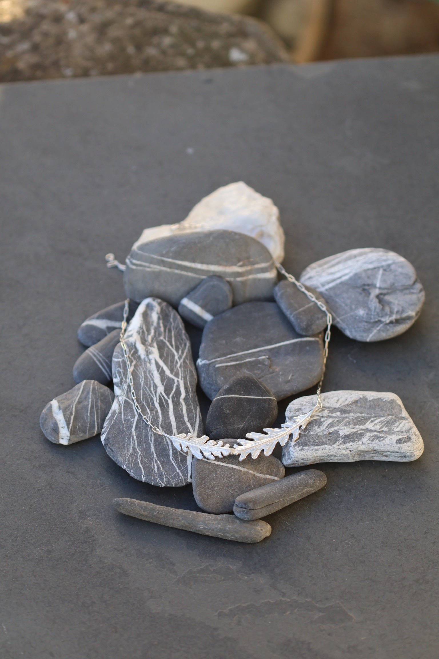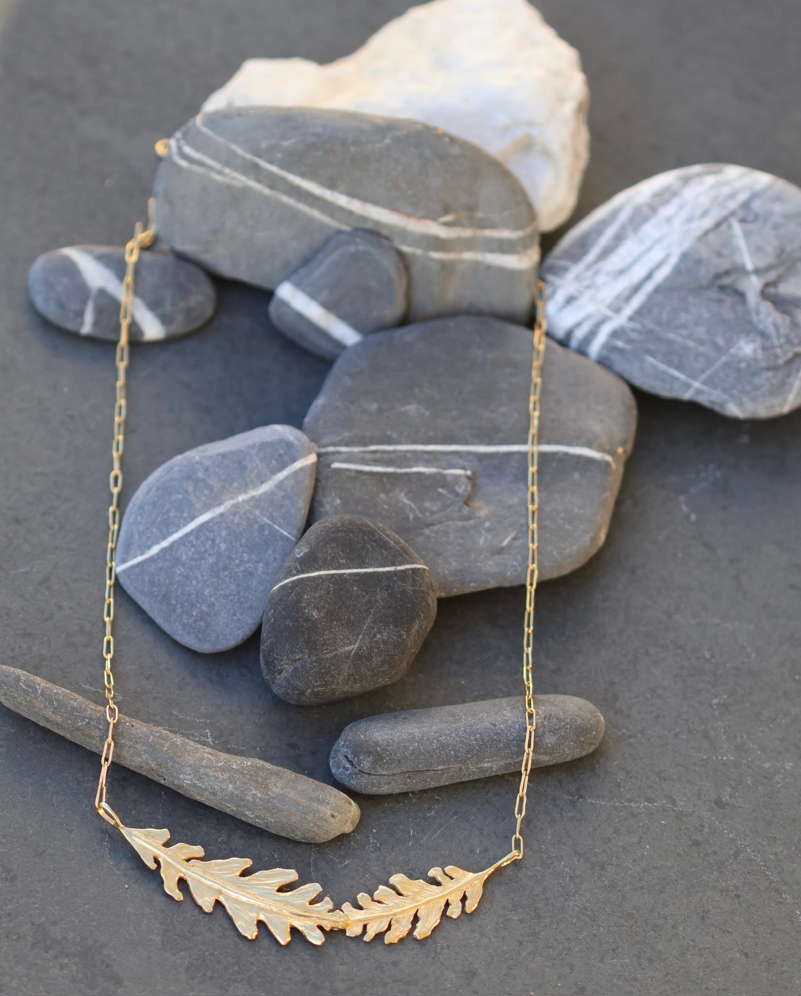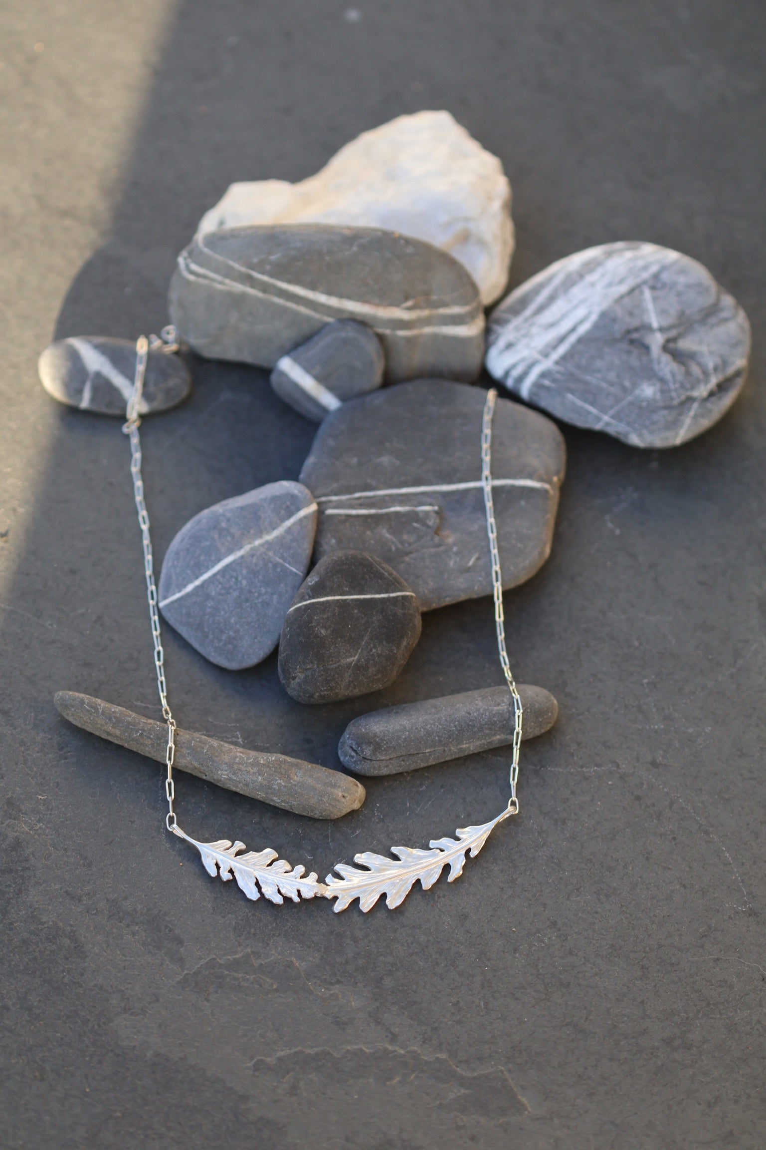 Inspired by the Arts and Crafts movement, this stylish necklace features two beautifully detailed bur oak leaves, handcrafted from sterling silver set onto a letterbox shaped chain. The organic design pays tribute to nature’s beauty, with the intricate texture of the leaves adding depth and character. This timeless piece captures the essence of botanical elegance, perfect for those who appreciate artistic craftsmanship and nature-inspired jewellery.
