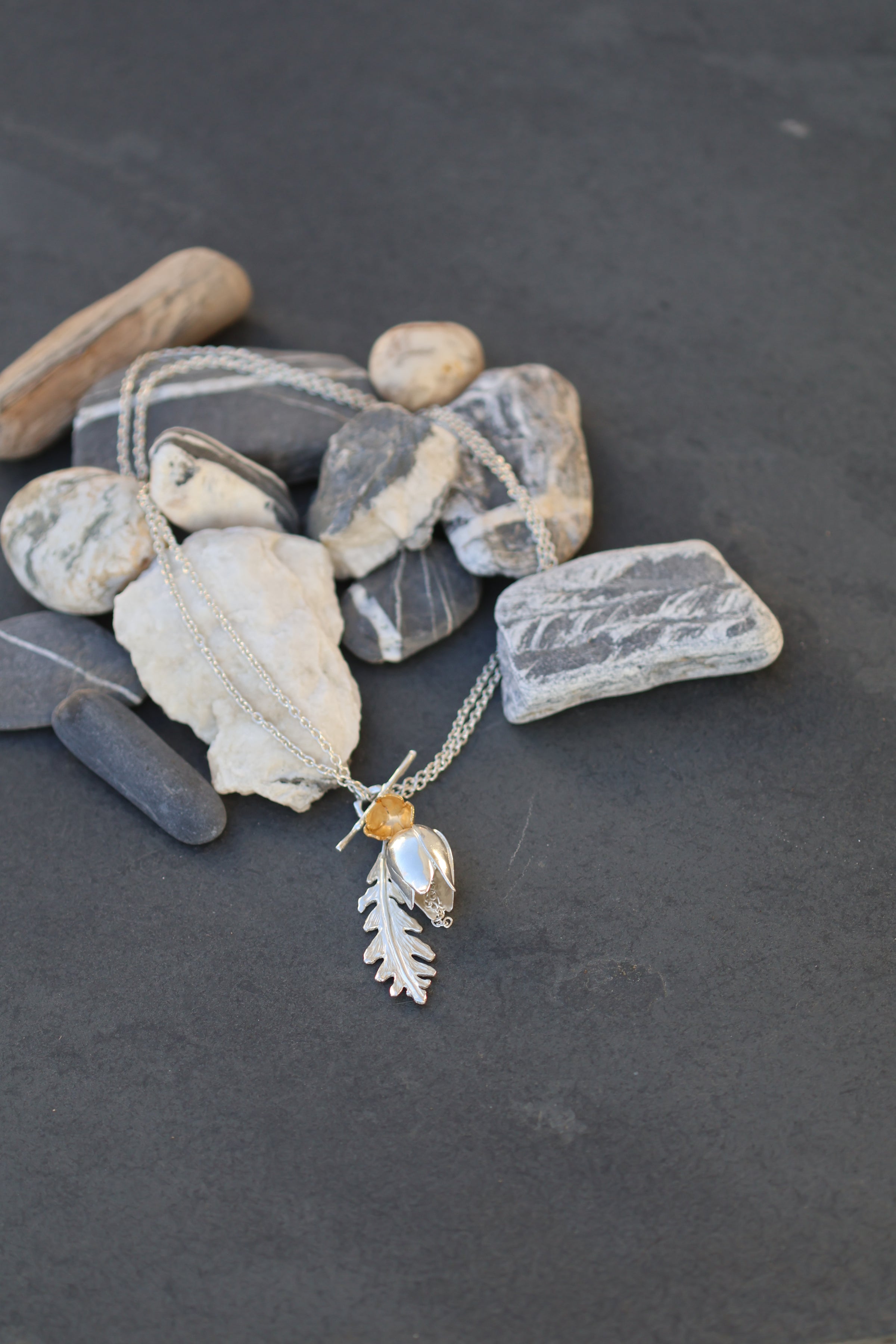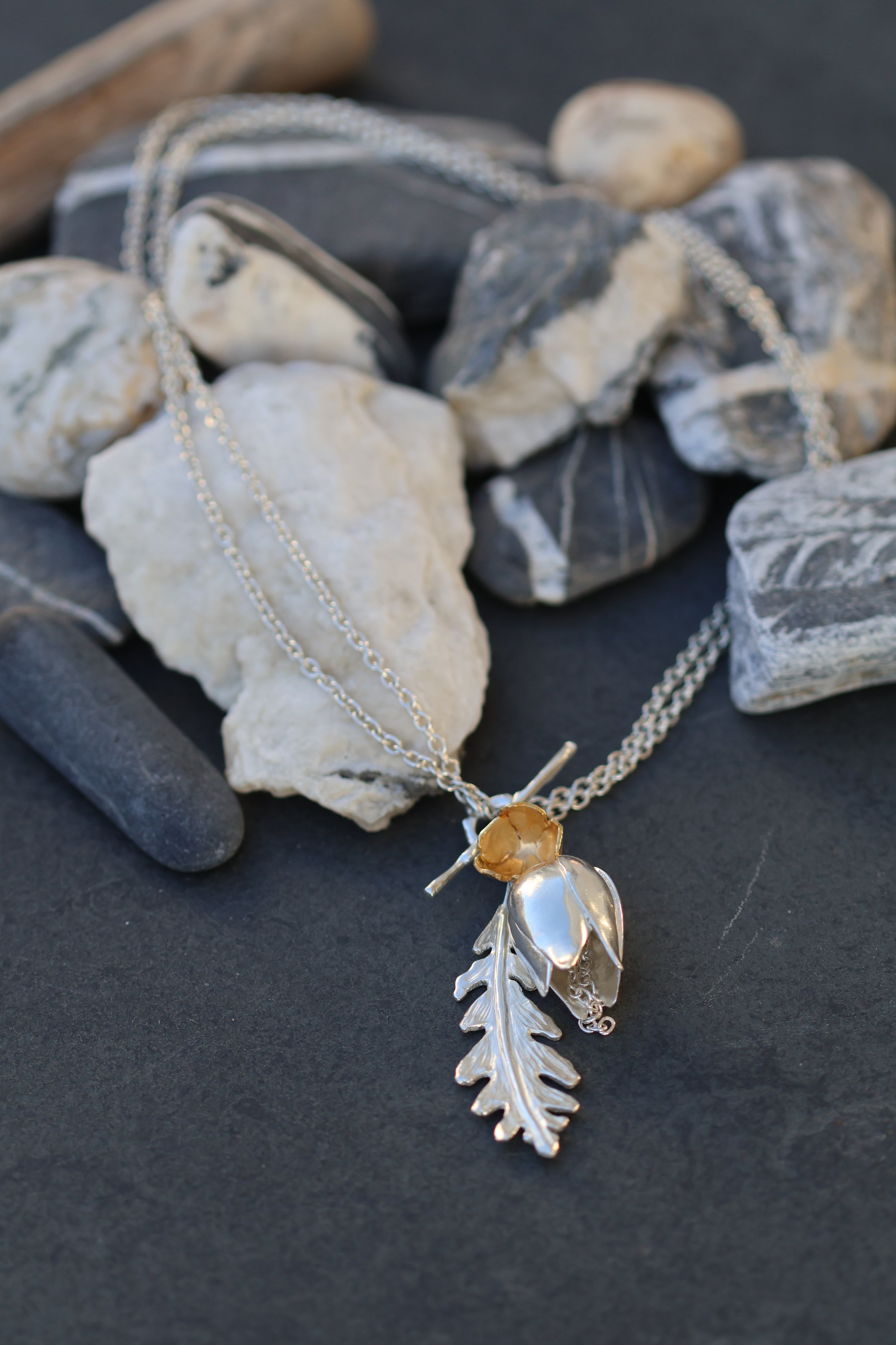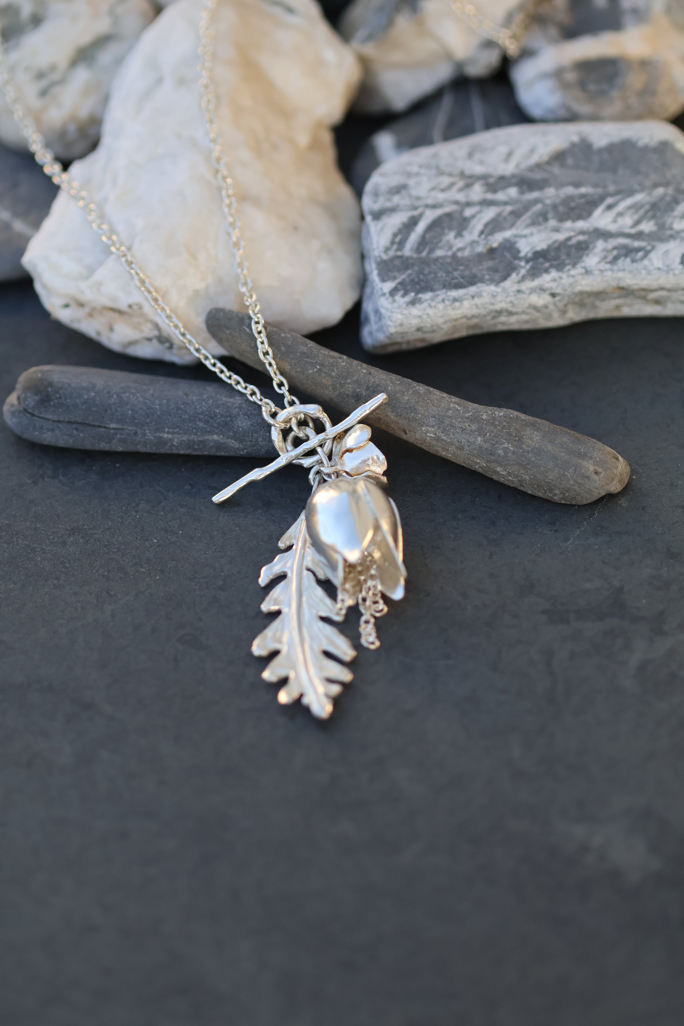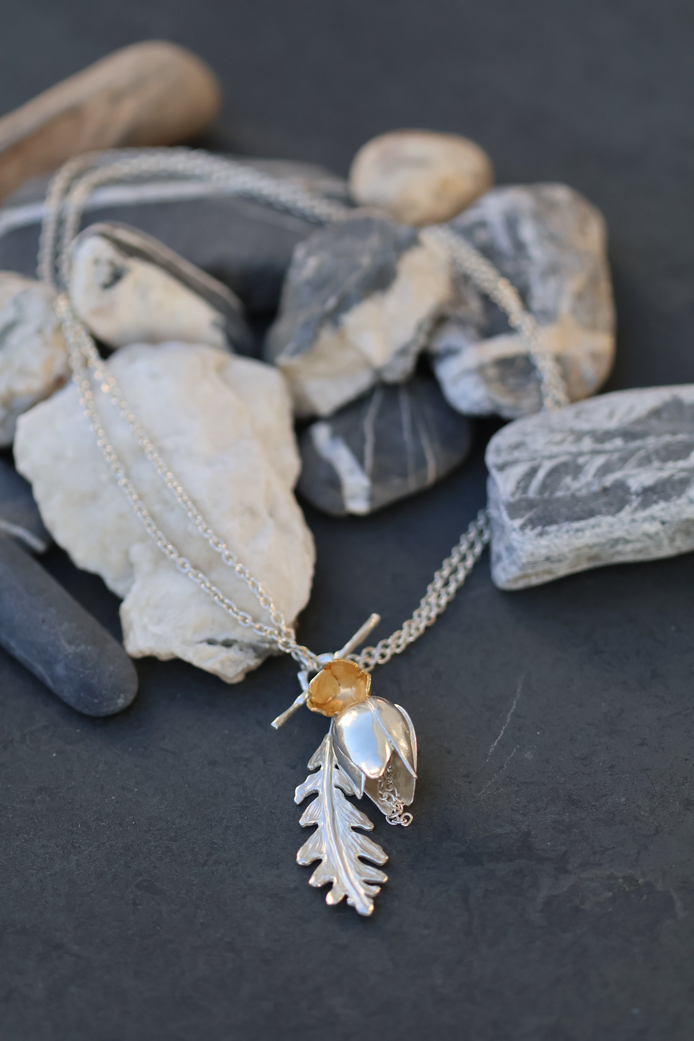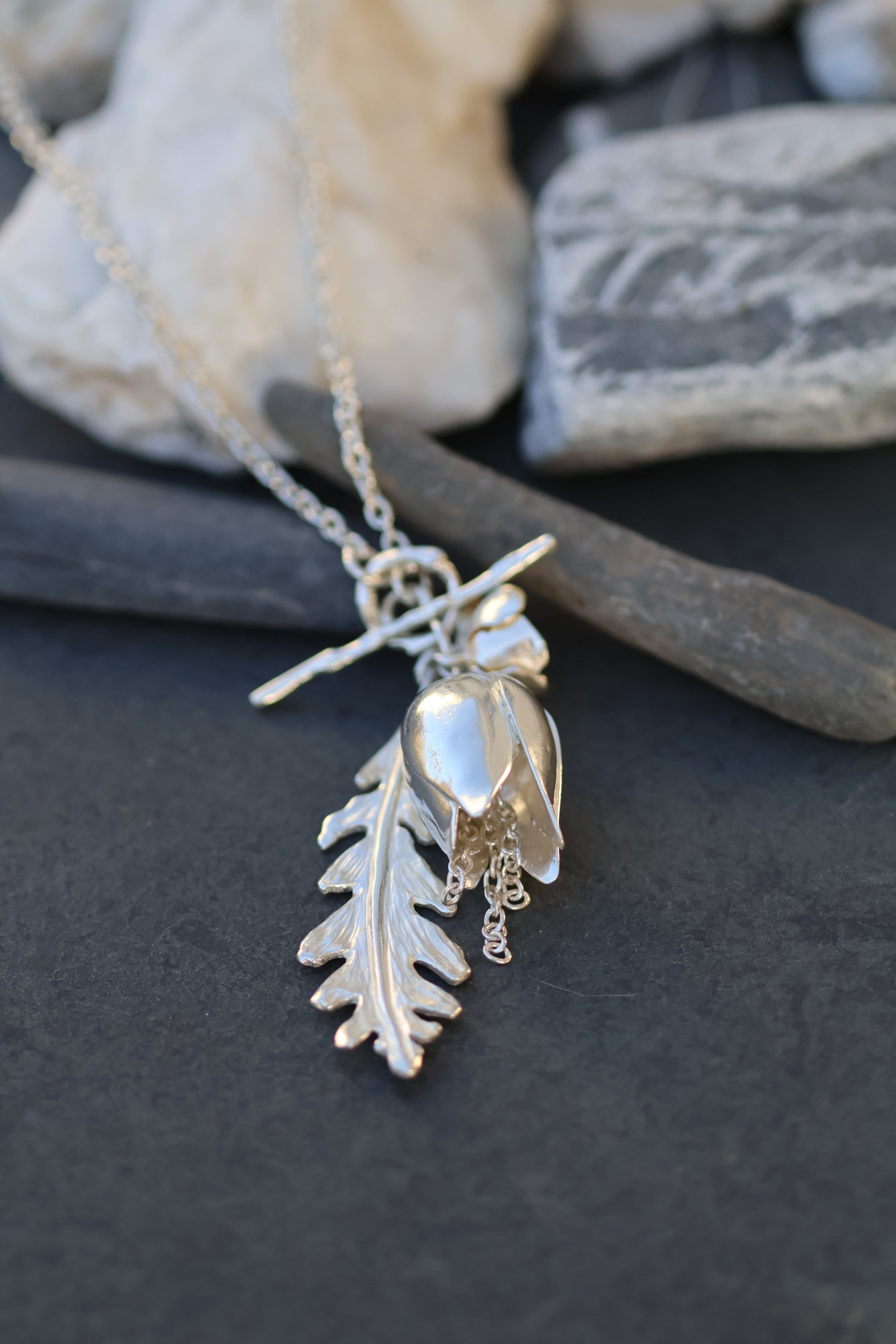 This 30-inch handmade silver botanical design necklaces, inspired by the Arts and Crafts movement, features a lovely trace chain and a unique design with an fritillaria, a gold plated buttercup and a long oak leaf. The T-bar and ring connector allow you to wear it either long or shortened for versatility. Crafted with care, this piece beautifully captures the natural elegance of botanical forms, combining the grace of the fuchsias with the timeless symbolism of the oak leaf. Perfect for both everyday wear and special occasions, this necklace embodies the earthy craftsmanship and floral beauty of handmade silver jewellery