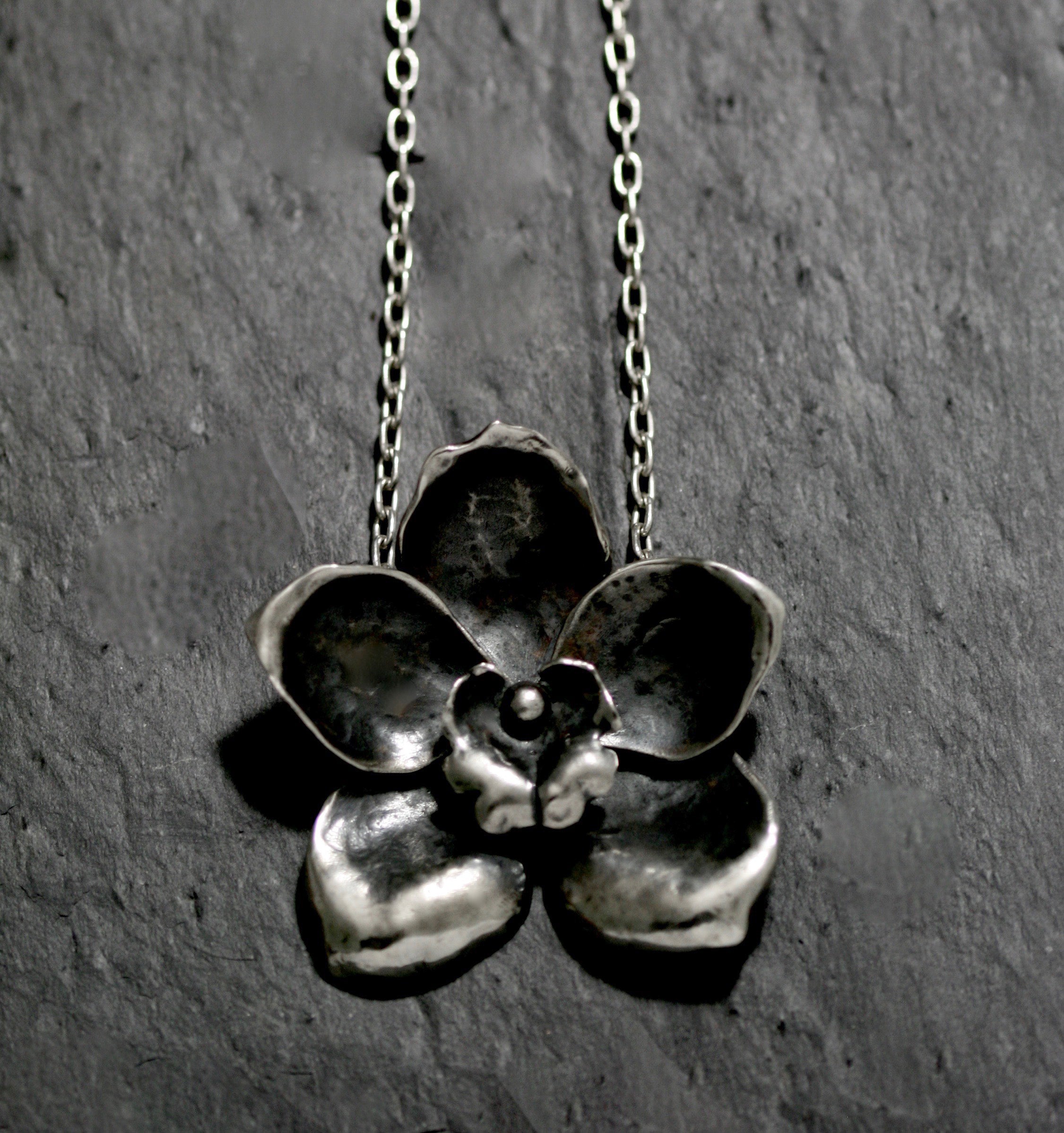 My very sculptural Sterling silver large orchid flower is made in three pieces before being assembled, burnished and carefully oxidised to produce a beautifully balanced statement necklace. Set on a lovely heavy 100 flat oval 18 inch chain with a handmade hook catch.