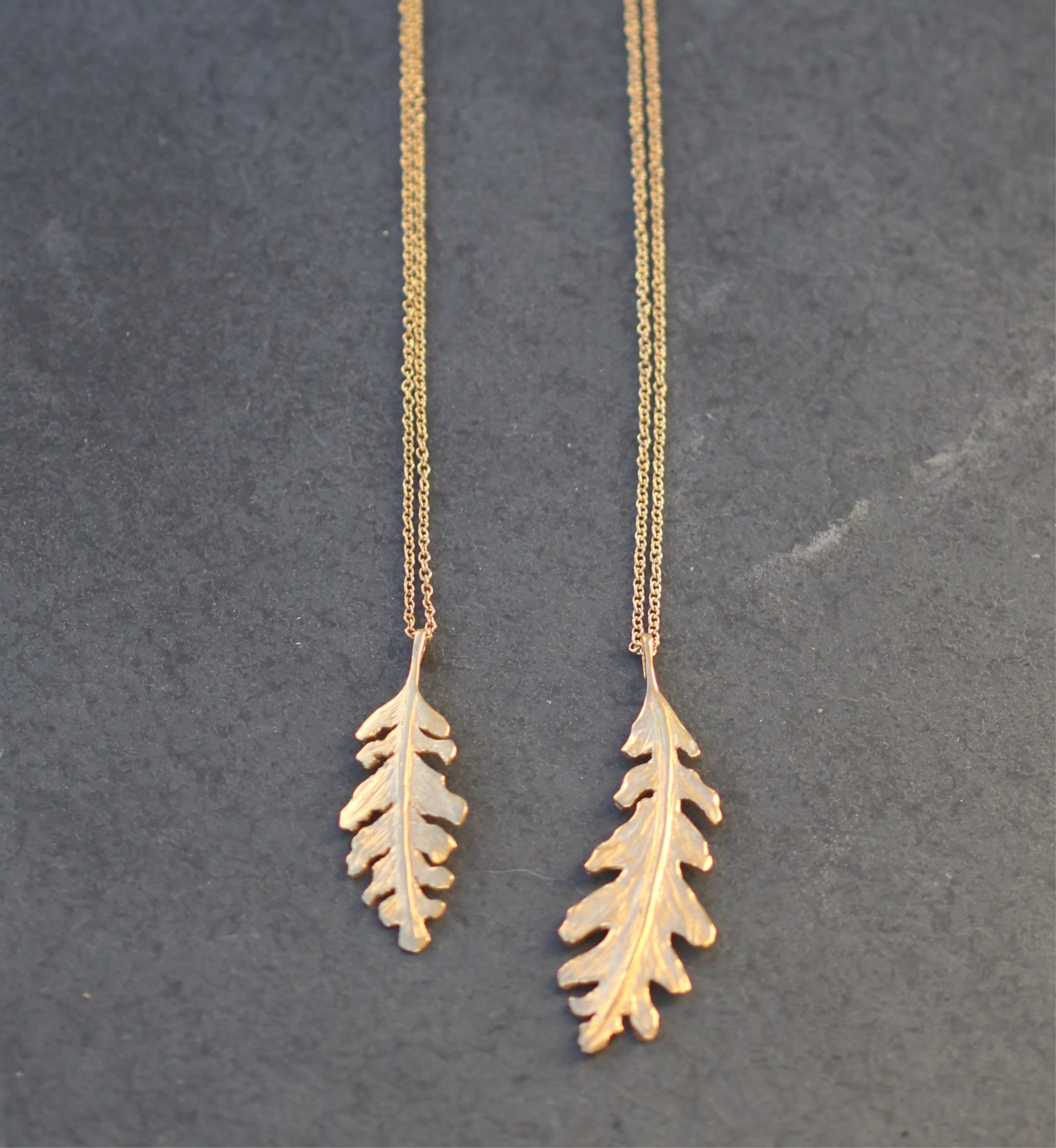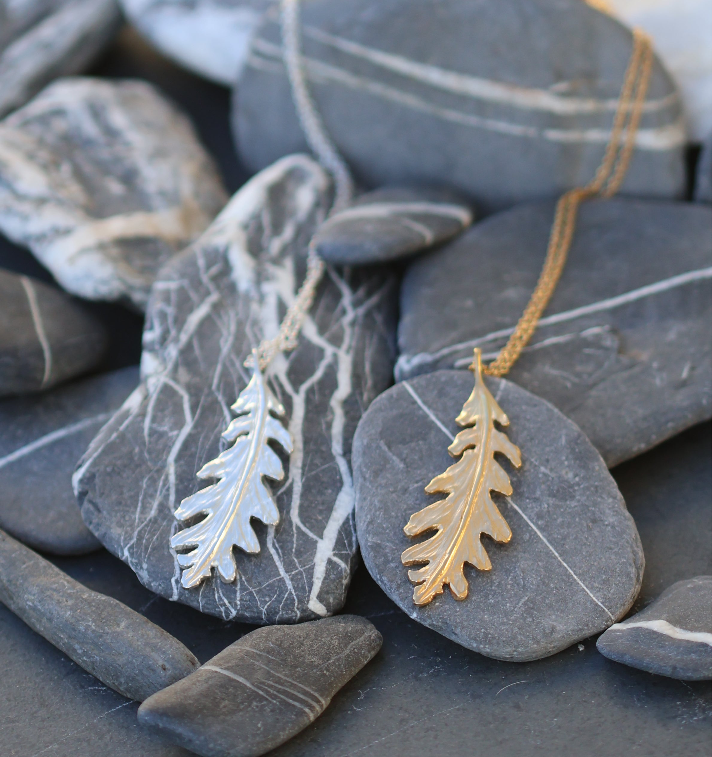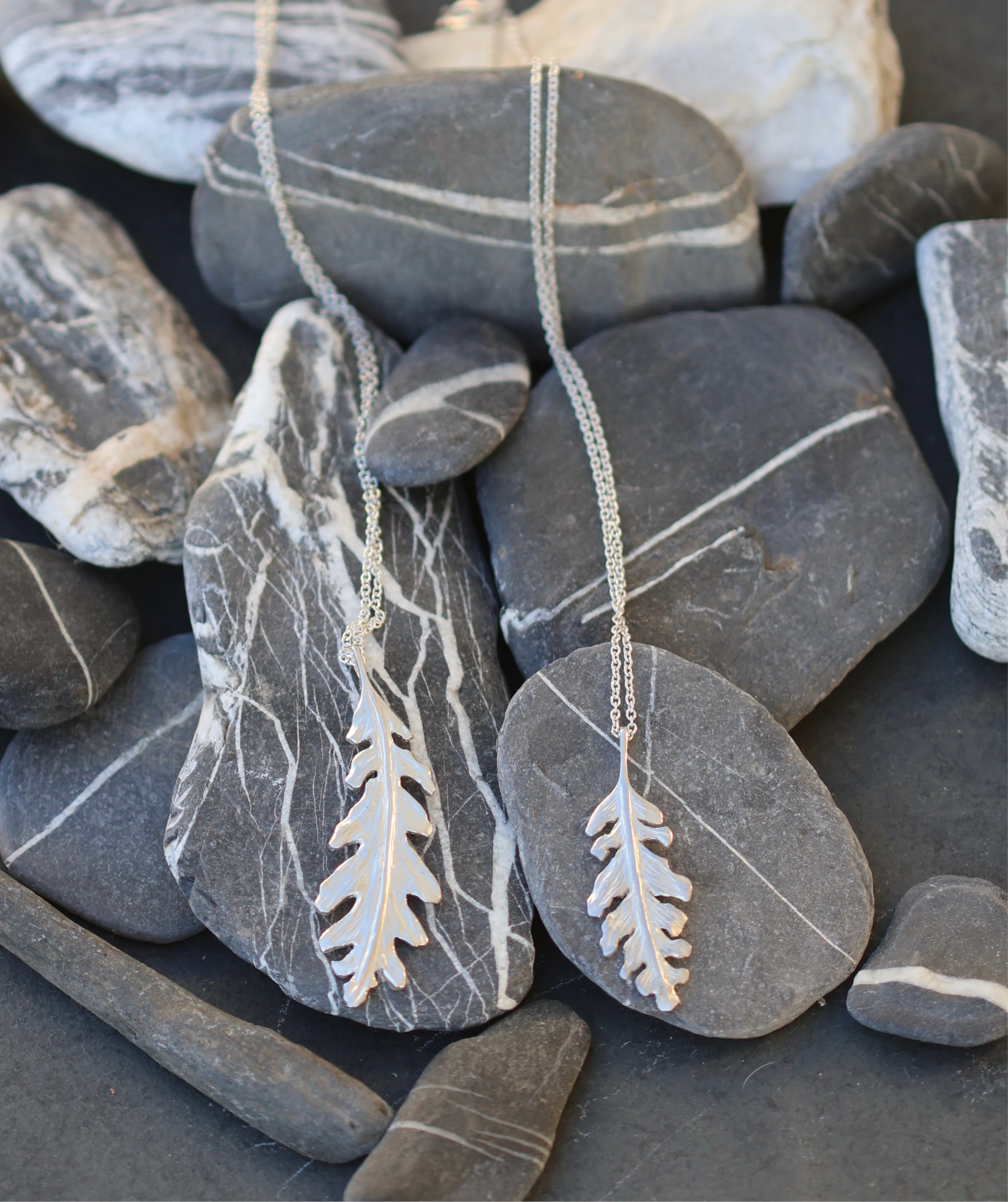 My new silver oak leaf necklace inspired by the Bur Oak tree and is more of a statement design than my other botanical designed oak leaf necklaces.  Available in two sizes and a choice of stirling silver or luxurious 22ct gold vermeil finish.  Each leaf features intricate hand-crafted details capturing nature's artistry. The oak leaf design celebrates my adherence to traditional craftsmanship and botanical motifs. Each artisan-made jewellery piece hangs from a delicate sterling silver chain, perfect for everyday wear or special occasions.