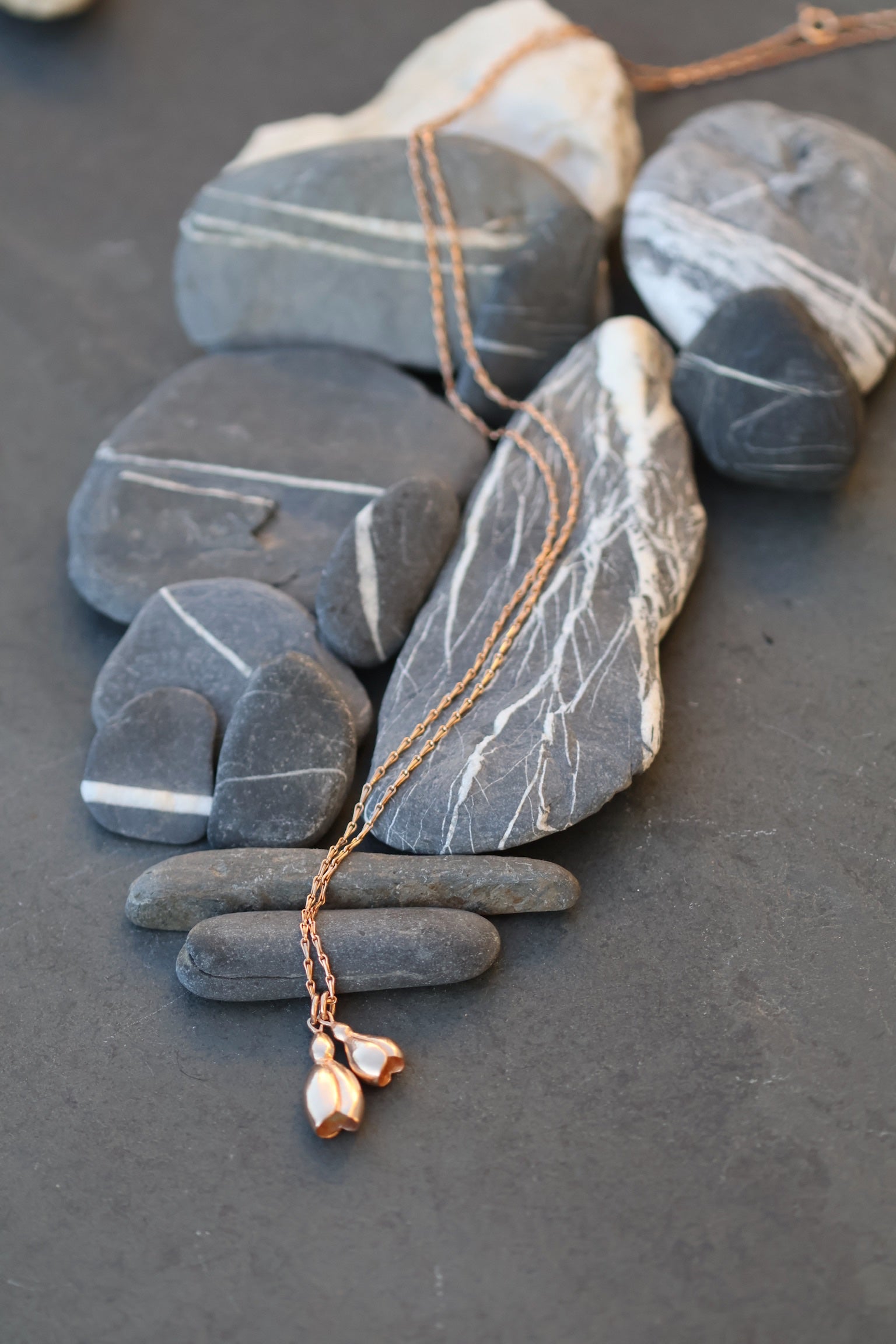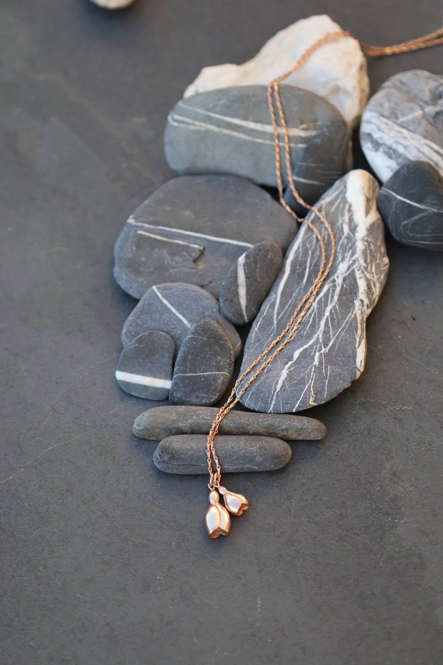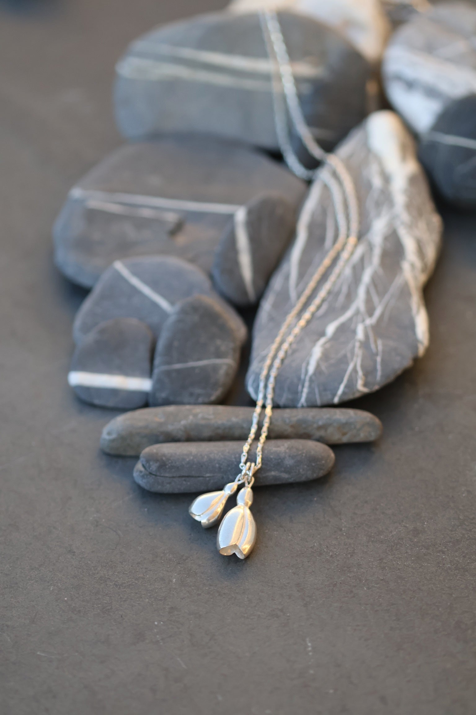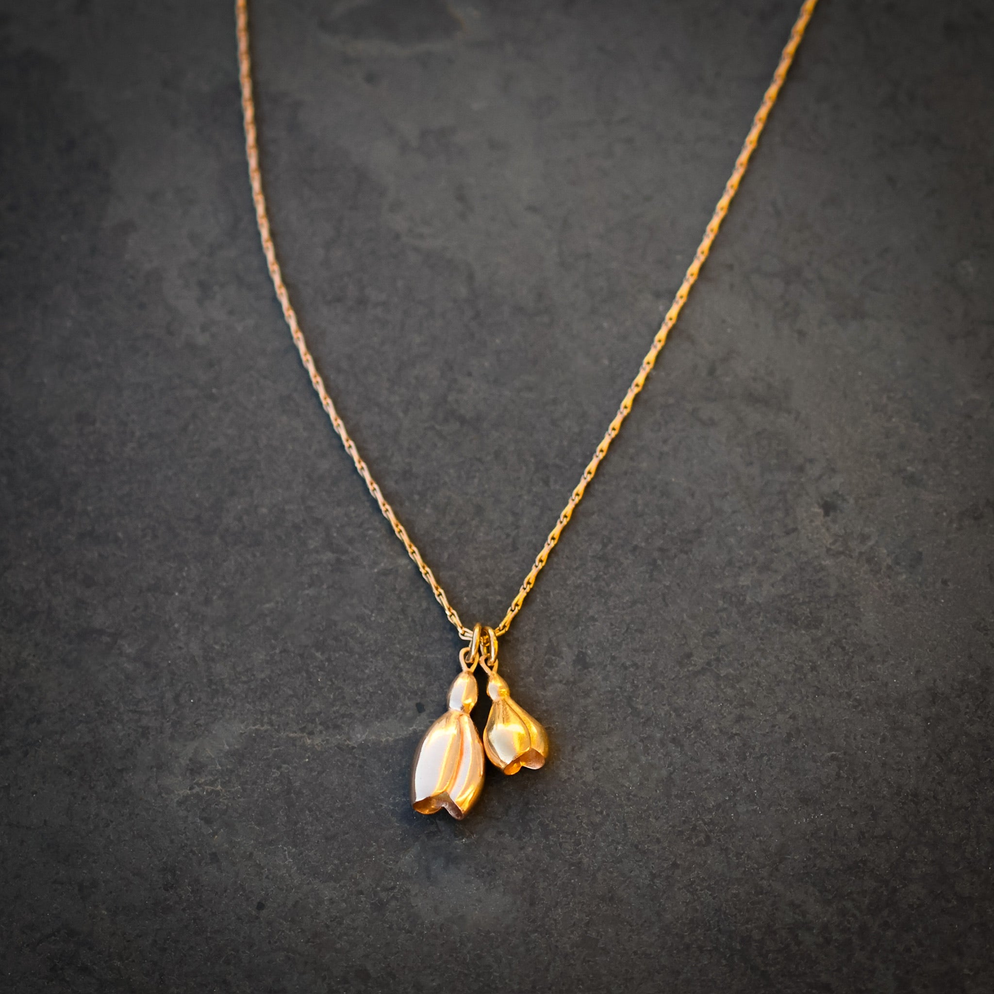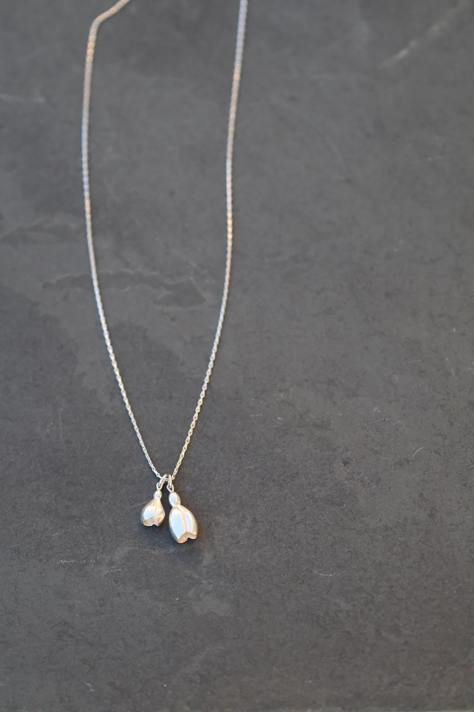 A pretty design with two snowdrops set onto a lovely barleycorn long silver chain. When we started our adventure of exhibiting and selling at RHS events we were invited to a spring show at Linley Hall behind their London headquarters known then as the snowdrop show. My new snowdrop design is inspired by the passion of galanthophiles we met there.